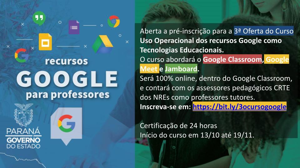 3ª Oferta do Curso Uso Operacional dos recursos Google como Tecnologias Educacionais. 23/09/2021 - 13:20
